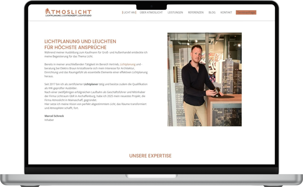 Eine High-End-Markenpräsenz, die den exklusiven Standard von Atmoslicht perfekt widerspiegelt. Vom ersten Google-Suchergebnis über den Klick auf die Website und das Überreichen der edlen Broschüre bis hin zum beeindruckenden Messeauftritt – alles greift nahtlos ineinander. Ein durchgängiges Erlebnis, das Vertrauen schafft und hochwertige Anfragen generiert.